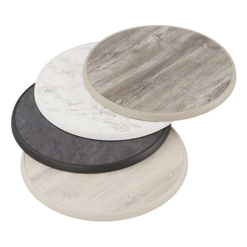 Sevelit table tops are excellent tops to use in outdoor dining, cafes, restaurants, conferences and party rooms. They are resistant to water, alcohol, UV and also to scratches. We stock 4 colors in several different sizes. These table tops fit our Ferrea stands (for outdoor and indoor use) and also our Studio stands (for indoor use).